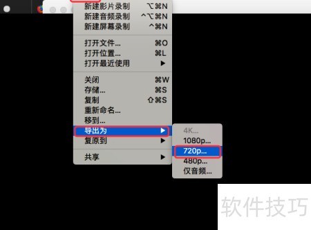 4、 在顶部菜单选择文件→导出为,根据需求选取分辨率如720,操作步骤见下图所示。