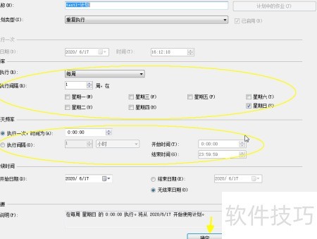 6、 在作业计划属性设置中,选择重复执行类型后,可设定频率为日、周或月。每日执行可选一天一次或按指定时间间隔多次运行,根据实际需求配置后,点击确定完成设置。
