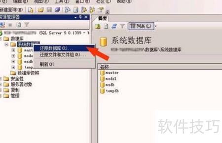 3、 在数据库界面,右键点击并选择还原数据库选项即可执行操作。