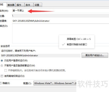 3、 在创建任务对话框的常规选项卡中,于名称文本框内输入任务名,例如第一节课上。