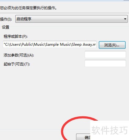 8、 在新建操作窗口中指定程序,点击浏览选择音乐文件,确认后完成设置。