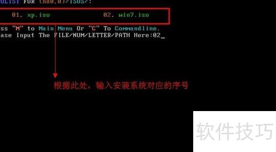 4、 根据ISO文件夹中列出的系统镜像,输入对应系统的序号。例如,若要安装XP系统,则输入01,然后按回车键确认,操作界面所示。