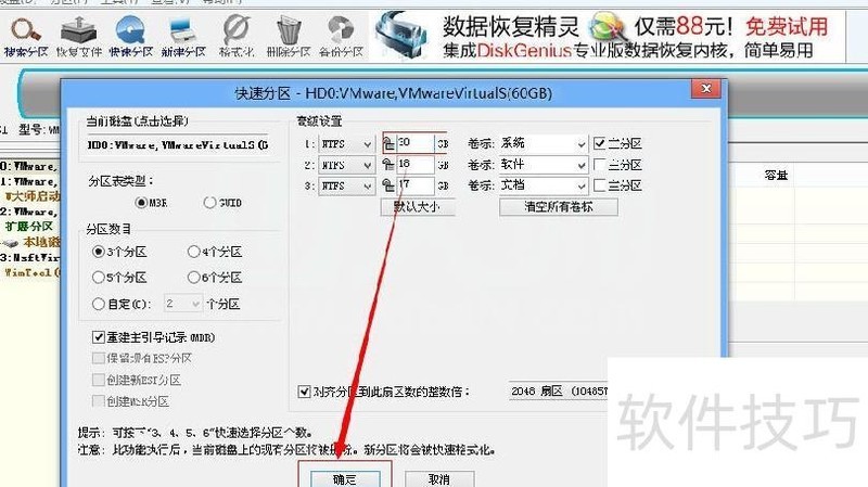 3、 点击快速分区功能,若硬盘原有分区尚未清除,请先删除所有分区,再进行快速分区操作。