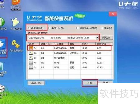 4、 运行桌面U大师一键还原工具,选择系统还原,定位WIN8系统文件,指定安装分区后点击开始即可。