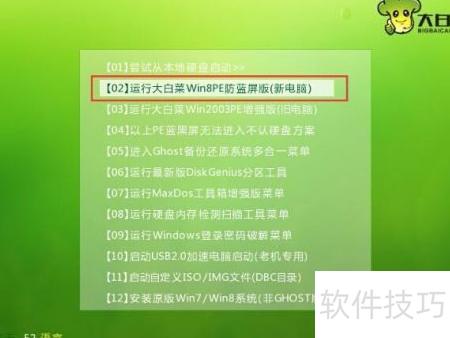 1、 将制作好的大白菜U盘插入USB接口,台式机建议连接机箱后置接口。重启电脑,在开机画面出现时,通过启动快捷键进入U盘引导,进入大白菜主菜单。选择运行大白菜Win8PE防蓝屏版(新电脑)选项,按下回车键确认执行,即可进入PE系统界面,准备后续操作。整个过程需确保U盘连接稳定,操作及时准确。