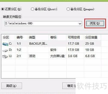 2、 成功进入大白菜PE桌面后,系统将自动启动一键装机工具,点击浏览选项,即可从U盘中选择预先存放的Win10系统镜像文件进行安装操作。