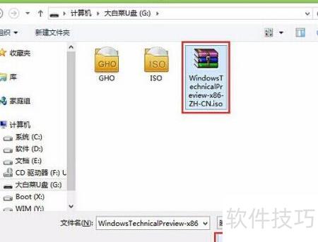 3、 在打开的窗口中,选择大白菜U盘中的Win10系统镜像文件即可。