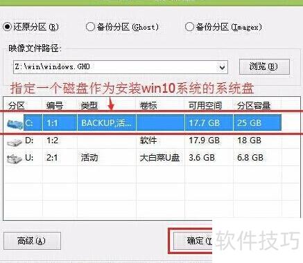 4、 解压系统镜像后,回到大白菜PE一键装机界面,选择目标磁盘作为Win10安装盘,确认无误后点击确定(Y)开始安装系统。