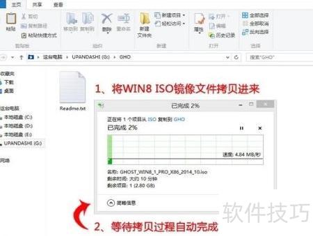 1、 将下载完成的WIN8系统镜像文件复制到U盘的GHO目录中,该过程因文件体积较大,耗时约5至10分钟,请耐心等待直至拷贝结束。