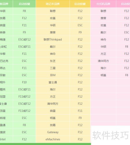 3、 电脑启动时,需反复按下指定快捷键,通常是F12,但不同型号的设备可能使用不同的按键,具体可参考下方的启动键对照表。进入启动菜单后,屏幕上会显示多个选项,此时可通过上下方向键↑↓进行选择。请在列表中寻找带有USB字样或显示U盘品牌英文名称的选项,这通常就是所插入的U盘。选中后按回车键确认,即可进入U盘装机大师的主界面。为方便用户操作,已汇总整理主流品牌主板进入U盘启动模式的快捷键信息。用户可根据自己电脑的主板品牌,在提供的列表中查找对应的热键,从而快速实现从U盘启动并进入装机工具界面,顺利完成系统安装或维护操作。