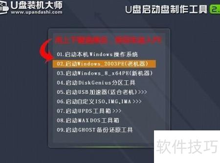 4、 进入U盘装机大师的启动菜单后,使用方向键选择02.启动Windows_2003PE(老机器)或03.启动Windows_8_x64PE(新机器),根据实际电脑配置决定。由于本次操作所用设备年代较久,因此我们选择02.启动Windows_2003PE(老机器)。选定选项后按下回车键,系统将自动加载并进入PE环境,为后续操作做好准备。整个过程简单直观,适合各类用户操作。