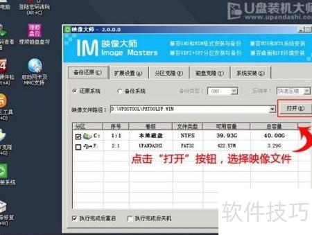 7、 进入映象大师,点击打开按钮,选取存入U盘启动盘的ISO文件即可。