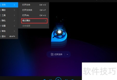 2、 点击左上角QQ影音图标,选择文件中的最近播放选项,操作所示。
