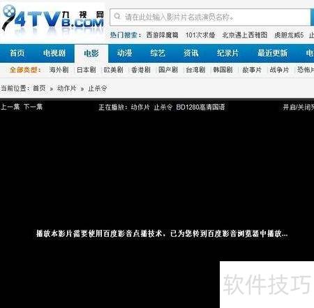 3、 输入支持百度影音在线播放的网站,或通过百度搜索相关站点,查找想看的电影,找到影片下方的百度影音播放选项并点击即可观看。
