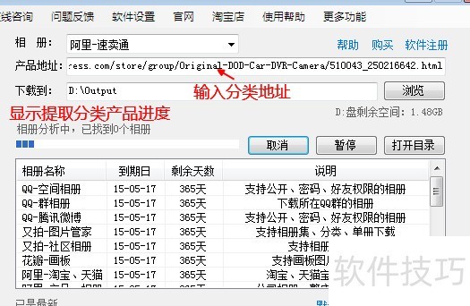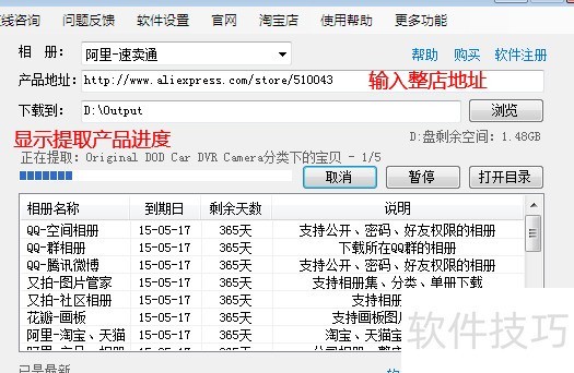 4、 打开软件,选择阿里-速卖通相册,输入需下载的产品链接,支持整店、分类或单品下载,具体操作可参照示意图。