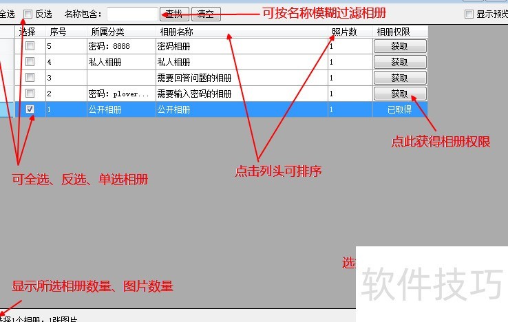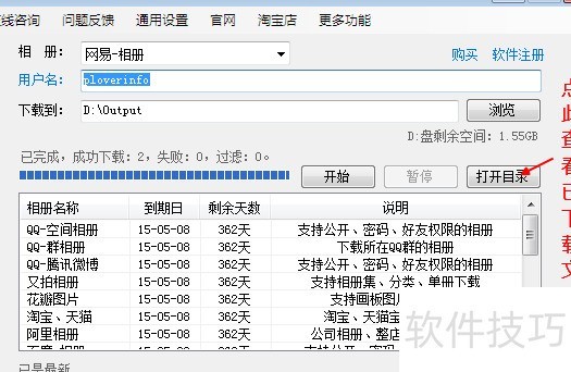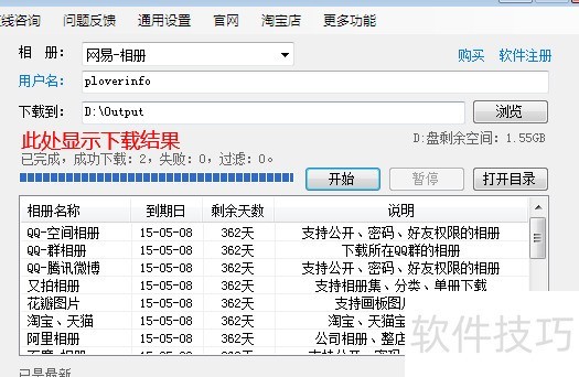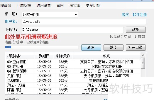 5、 将复制的用户名粘贴至软件用户名输入框,点击获取相册按钮,稍等片刻,软件会自动读取并显示相册列表,具体界面所示。