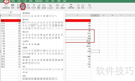 8、 在菜单中点击插入选项卡,选择图形后会出现下拉列表,用户可根据需求挑选各类形状,包括常见的圆形、矩形,也包含多种复杂图形,满足不同设计需要。