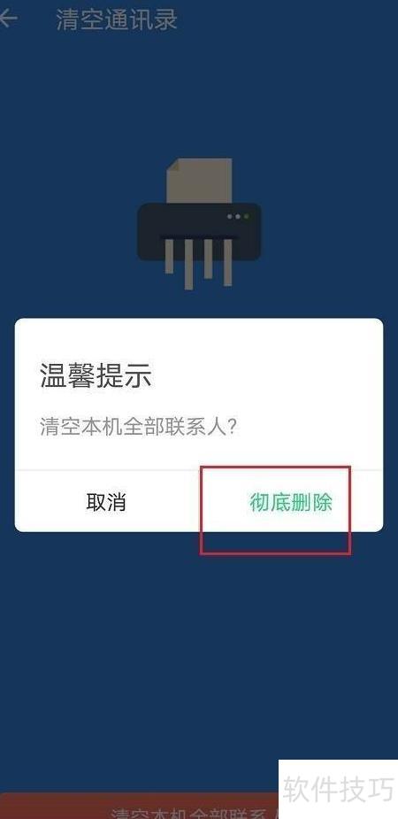 5、 弹出提示框后,选择彻底删除即可清空通讯录,操作所示。