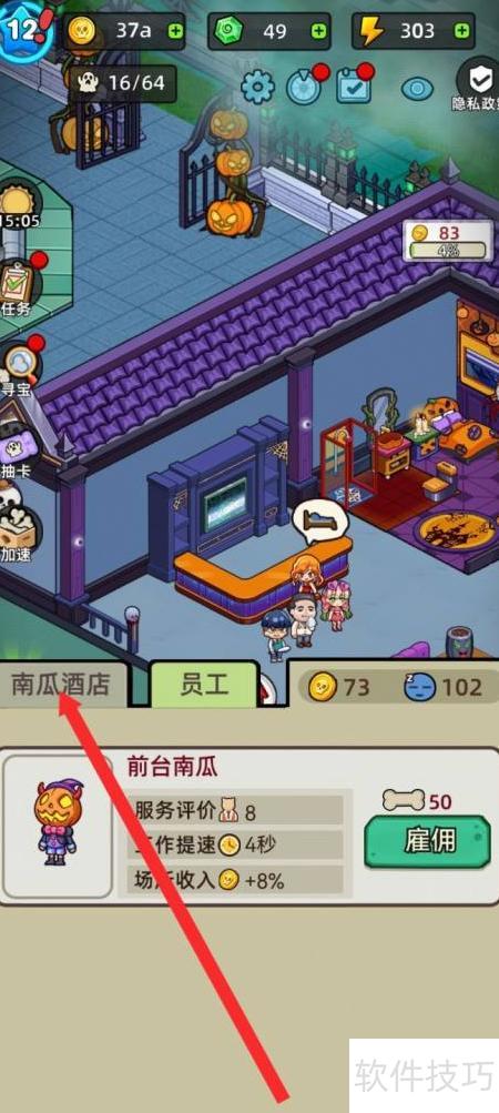 1、 打开手机中的猛鬼打工日记,进入游戏后点击南瓜酒店图标。