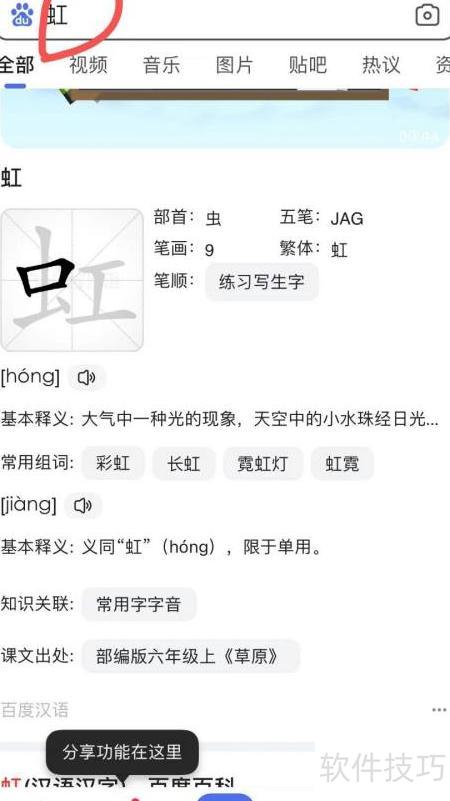 1、 打开百度App,搜索虹字,可查读音及背后故事,理解其含义后记忆更轻松。