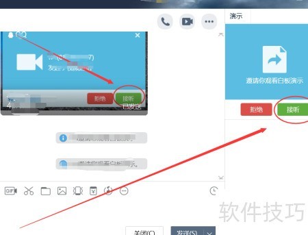 4、 对方QQ会弹出视频通话请求界面,点击接听即可开始远程视频,点击拒绝则中断通话。