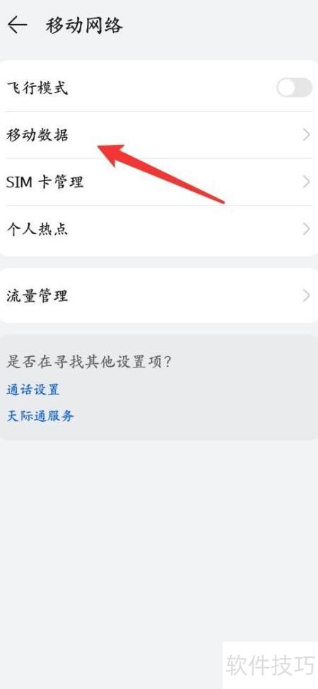 4、 进入移动网络设置,点击移动数据以打开相关配置选项。