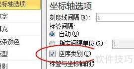 7、 此时,开始日期系列将变为透明。由于纵坐标轴上的项目名称排列顺序与数据区域中的顺序相反,不符合常规习惯,可通过以下方式调整:选中垂直(类别)轴,对话框标题会自动切换为设置坐标轴格式。在坐标轴选项中勾选逆序类别,此时横坐标轴会移至图表上方。若需将其恢复至图表下方,可在横坐标轴交叉区域选择最大分类选项,即可完成调整,使图表布局更符合阅读习惯。