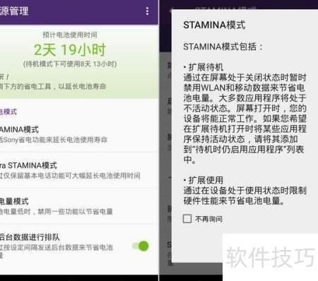35、 STAMINA模式分为延长待机和延长使用两种。前者在待机时阻止后台程序唤醒,并仅允许指定应用联网,从而节省电量;后者则通过降低处理器性能、调暗屏幕亮度等硬件限制手段,在使用过程中减少能耗,实现更持久的续航效果。两种模式分别针对不同使用场景优化电力消耗。