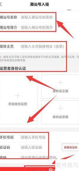 3、 进入潮汕号入驻页面,填写账号头像、名称、简介、媒体主页,完成运营者身份认证,输入手机号、验证码及密码后,点击立即入驻即可提交申请。