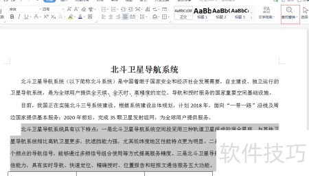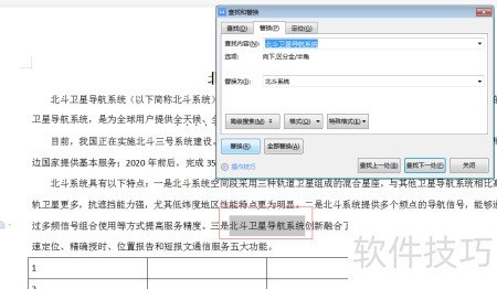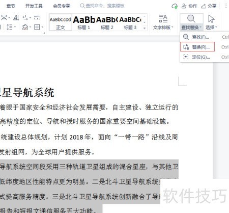在WPS 2019中,打开文档,使用查找替换功能,定位第三段中的北斗卫星导航系统,将其替换为北斗系统即可。