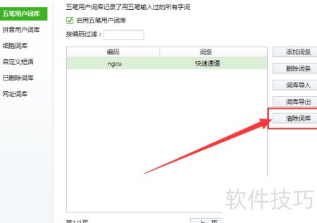 3、 进入五笔用户词库设置,点击清除词库选项。
