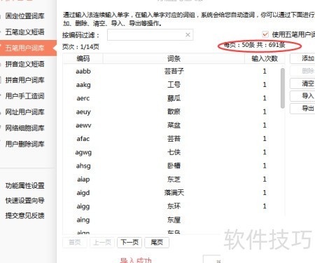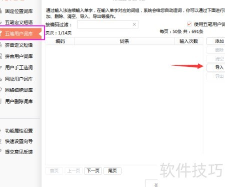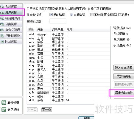 2、 进入用户词库,浏览词条列表,点击右侧按钮导出当前选中...