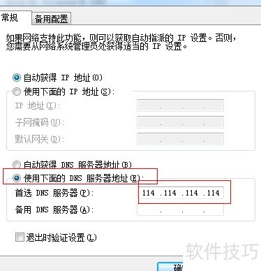 4、 在IP地址设置界面中,按图示将首选DNS服务器设置为114.114.114.114(四个114),完成后点击确定按钮保存配置即可。