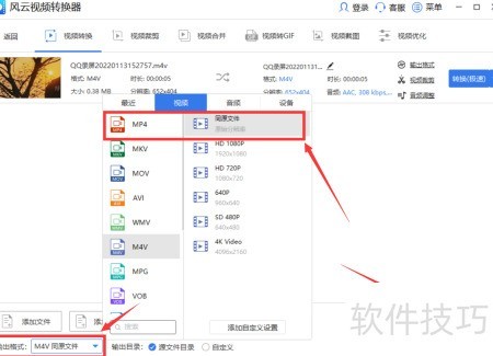 打开风云转换器,选择视频转换功能,添加文件后设定输出格式为MP4,点击全部转换,即可轻松解决M4V更改后缀转MP4的问题。