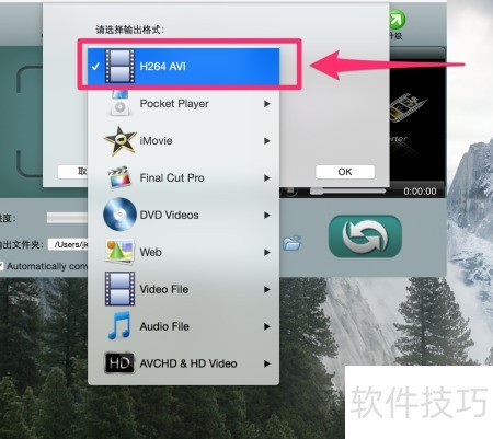3、 从下拉菜单中众多格式里,依次选取视频文件→AVI→H264 AVI,确认选择后点击下一步继续操作。