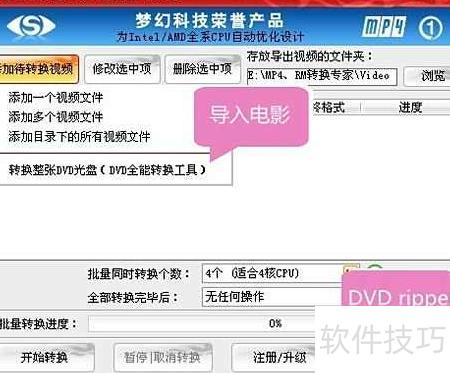 2、 MP4/RM转换专家具备强大的视频格式兼容能力,几乎可导入所有主流电影文件。只需点击界面右上方的添加待转换视频按钮,便可轻松将本地影片加入转换队列。软件内置高效稳定的多核CPU并行处理引擎,能够充分发挥计算机性能,在导入多个文件或整批目录时,用户可根据自身硬件配置启用多线程加速转换,大幅提升处理速度。若拥有DVD光盘中的影片资源,可使用右下角的DVD全能转换功能,快速读取光盘内容,完整保留原片包含的字幕、音轨、视角等信息,并将其高效转换为移动设备广泛支持的格式,如MP4、3GP、3G2、AVI等,满足多样化播放需求,操作简便,转换质量出色。