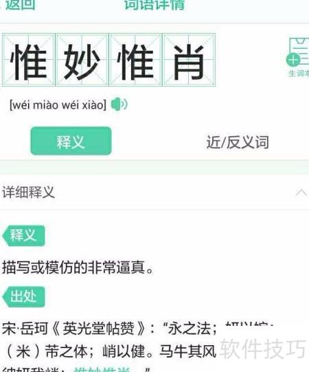 3、 例如查看惟妙惟肖这一成语时,可登录百度账号将其添加至生词本,便于日后复习。释义页面还提供发音及近义词、反义词等详细信息,方便全面学习与掌握。
