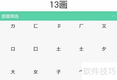 6、 可先统计汉字总笔画数,选择笔画选项,再通过部首筛选,迅速找到目标汉字。