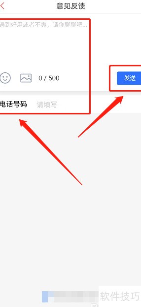 8、 进入反馈页面,填写意见、电话并上传图片后,点击发送按钮即可提交。
