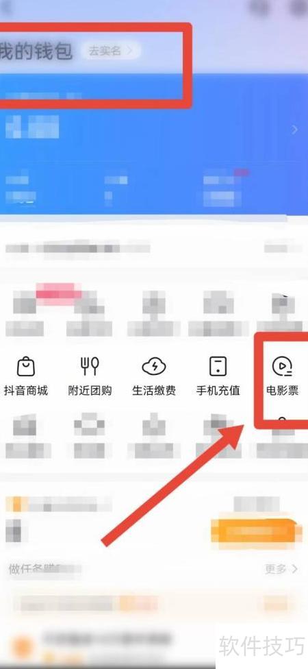 1、 进入抖音我的钱包,点击电影票选项(见图示箭头位置)。