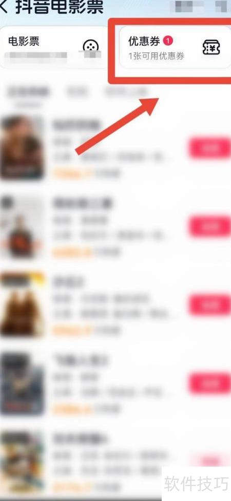 2、 打开抖音电影票页面,点击优惠券按钮,位置所示。