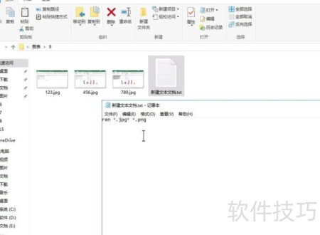 3、 双击打开新建文档,输入命令ren *.bmp *.jpg,此命令用于批量修改文件后缀名,将所有.bmp文件更改为.jpg格式,操作效果所示。
