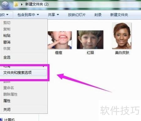 11、 点击文件夹左上角的组织按钮,找到并选择文件夹和搜索选项,不同系统操作类似,根据界面提示即可轻松完成设置。