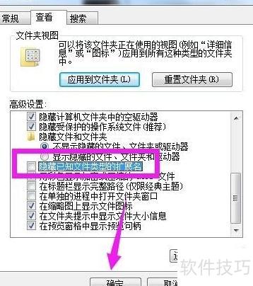 12、 点击后取消隐藏已知文件类型的扩展名前的勾选,再确认即可。