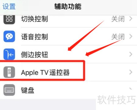 2、 进入辅助功能页面,选择并切换到Apple TV遥控器设置选项。