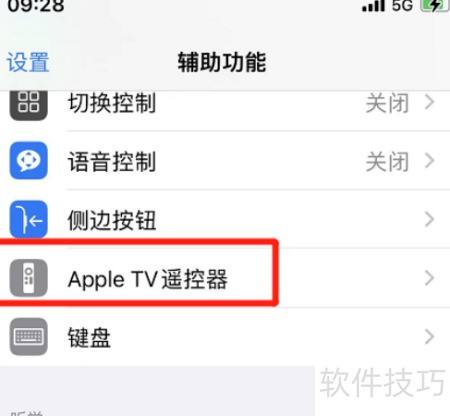 2、 进入辅助功能设置,找到并打开Apple TV遥控器选项进行配置。