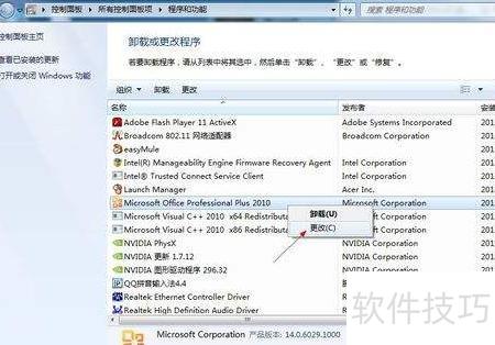 3、 右键点击Microsoft Office Professional Plus 2010,然后选择更改选项。