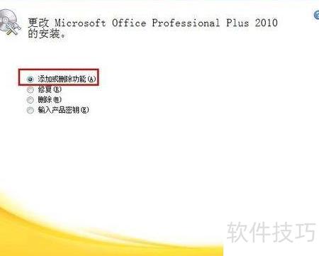 4、 在修改Office Professional Plus 2010安装的界面中,选择添加或删除功能选项,然后点击继续按钮以进行下一步操作。