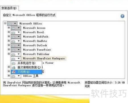 5、 选中Microsoft Sharepoint Workspace,点击右侧下拉箭头,然后选择不可用选项。