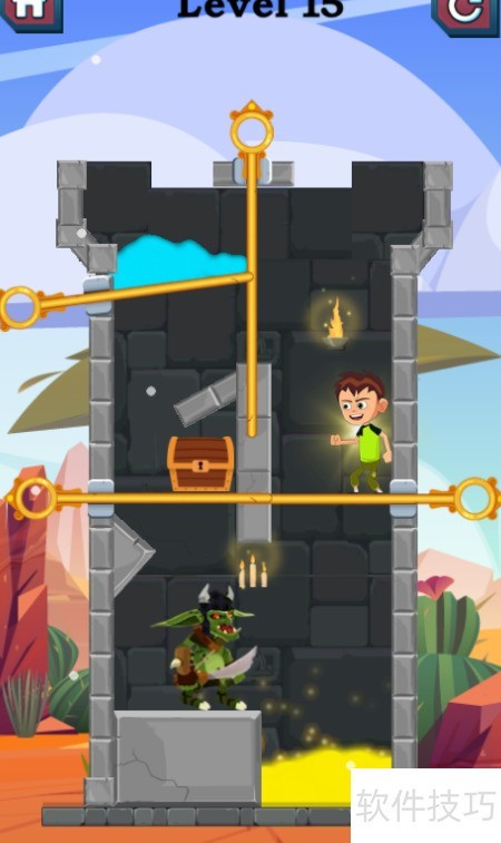 1、 本关需击败怪物士兵,清除下方熔岩,最终取得宝箱,具体情形见图示。